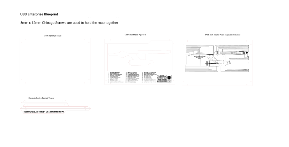 SVG file of a profile blueprint of the USS Enterprise. Contains cut and engrave for the backing board, the ship, the acrylic panel and the borders.